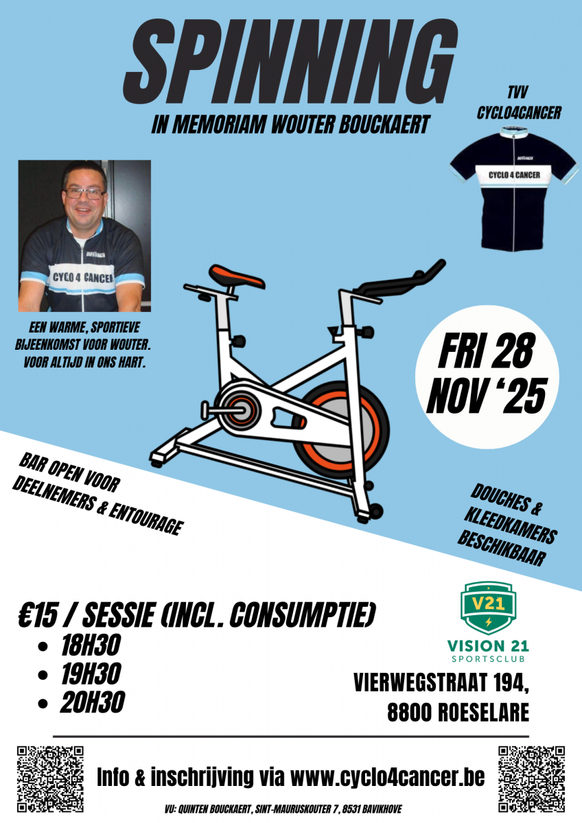 Op vrijdagavond 28 november gaat de 2e spinning In Memoriam Wouter Bouckaert tvv Cyclo4Cancer door. Zij die er vorig jaar aanwezig waren weten dat het echt fantastisch was... zorg dus dat je er (ook) deze editie bij bent! Je verneemt er alles over via deze link.